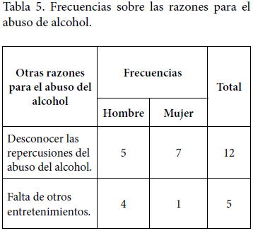 En la última categoría de la dimensión de factores, se les preguntó a los y las participantes sobre otras razones para el abuso del alcohol. Dentro de esta categoría, surgieron dos subcategorías (Tabla 5). Estas fueron: a) desconocer las repercusiones del abuso del alcohol; y b) falta de otros entretenimientos.
