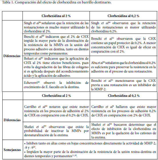 Priyadarshini et al21 identificaron los beneficios desinfectantes y antimicrobianos de la CHX y la examinaron, en diferentes concentraciones –las cuales presentan diferentes ventajas y desventajas (Tabla 1), como una opción terapéutica en la preservación de las capas híbridas en dentina humana, aplicando adhesivos de grabado y enjuague; se aplica CHX sobre las fibrillas de colágeno expuestas y luego es sellada en su lugar con materiales compuestos de resina adhesiva que tiene la capacidad de proteger el colágeno contra un ataque colagenolítico, lo que retrasa la degradación típica al momento de implementar adhesivos dentales. Sin embargo, esto no depende de la dosis porque en altas concentraciones tiene la capacidad de desactivar la MMPs por desnaturalización de la enzima, en lugar de la quelación de los cationes.