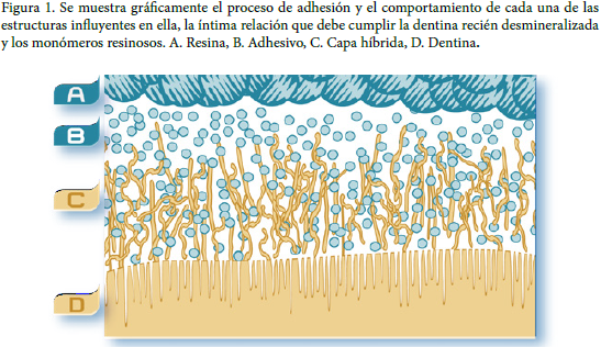 La capa híbrida es el resultado de la íntima relación que se forma entre los monómeros resinosos y los sustratos de dentina pretratada. La dentina desmineralizada y la fibras de colágeno forman dicha capa, la cual podrían evitar la presencia de hipersensibilidad y caries recurrente en la odontología restauradora si se logra sellar el intervalo que hay entre la dentina y el material restaurador28,43.