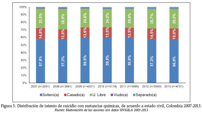 En este estudio se han analizado las características de los intentos de suicidio por intoxicación con sustancias químicas desde el año 2007 hasta el año 2013, encontrando que el comportamiento del evento es similar a lo registrado en la literatura en relación a la mayor ocurrencia en mujeres que en hombres: se documenta que las tasas o proporciones de comportamiento suicida no letal son tres veces mayores en las mujeres que en los hombres15. Esta dinámica de intento de suicidio se diferencia del suicidio consumado en tanto que los roles se invierten (por cada cinco hombres que se suicidan en Colombia, sólo una mujer lo hace) pero se explica porque los hombres generalmente buscan métodos más severos y letales que las mujeres, observándose esto no sólo en los suicidios de adultos, sino también en niños y adolescentes16.