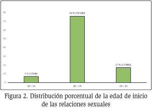 El 78,1% (100/128; IC95%: 70,2 – 84,4) de los estudiantes que participaron en el estudio afirman haber iniciado sus actividades sexuales. El 68% de los estudiantes que han tenido relaciones sexuales (68/100; IC95% 58,3 - 76,3) refirieron tener una pareja en el momento de responder el cuestionario (Figura 1). De los estudiantes de Bacteriología, que han tenido relaciones sexuales, el 76% (76/100; IC95% 66,8 - 83,3) tenía edades entre 15 y 19 años cuando tuvieron su primera relación sexual (Figura 2).