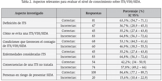 Los aspectos para evaluar el NC aparecen en la Tabla 2, entre ellos se destaca: cómo se evita una ITS. Al respecto, se encontró que el 35,2% (45/128) de los estudiantes que respondieron de forma correcta; entre las respuestas más frecuentes están: no teniendo relaciones sexuales, teniendo una pareja estable y usando preservativo. Con relación a la pregunta sobre las condiciones que favorecen el contagio de las ITS, el 53,1% (68/128) respondió correctamente y entre sus respuestas dadas indicaron: