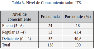 En cuanto a la medición del NC, de manera general se puede decir que el 41,4 % (52/128; IC95% 32,5 – 49,3) de los estudiantes tiene un NC regular sobre ITS (ver tabla 3).