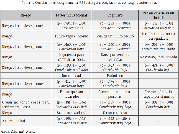 El coeficiente de correlación utilizado fue el coeficiente de Pearson. Se hallaron correlaciones muy bajas entre autoestima baja con factor motivacional (p= ,198; s= ,003) y con el factor cognitivo (p= 192; s= ,004). El auto concepto positivo tuvo correlaciones muy bajas con: la actitud positiva hacia sí mismo (p= , 181; s= , 007) y sentirse satisfecho consigo mismo (p= , 171; s= ,010). El riesgo suicida fue directamente proporcional al factor motivacional (p= ,734; s= , 000) ''correlación alta, factor cognitivo (p= ,595; s= ,000) ''correlación moderada'', y correlaciones muy bajas con el hecho de pensar que se es ''inutil'' (p= ,142; s= ,033), no sentirse orgulloso e inclinación a pensar en el fracaso (p= ,181; s= ,006), y de ser malas personas (p= ,187; s= ,005). Quienes afirman no sentir respeto por sí mismos también generan pensamientos de inutilidad (p= ,302; s= ,000) (tabla 1) ''correlación baja''.