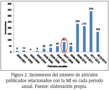 El número de artículos publicados fue de 3547. La Figura 1, muestra un aumento progresivo en la publicación de artículos referentes a la consulta, año tras año. Este resultado es indicativo de un creciente interés científico sobre esta área de investigación, que se refleja en el incremento de un 112% del número de artículos publicados, desde el año 2000 al 2013. Para determinar en qué periodo empezó a despuntar esta área de investigación, se calculó el incremento de artículos publicados en cada periodo anual (Figura 2), observándose un despunte en el periodo 2007-2008.