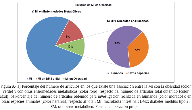 Al determinar el total de artículos en los que se asociaba la MI con la obesidad, se comprobó que más de la mitad de los artículos correspondían a estudios en modelos humanos, que podría asociarse a un interés clínico en definir las características de la MI que contribuyen al estado obesogénico. Muchas de estas publicaciones están centradas en el papel que la MI tiene en los mecanismos involucrados en la extracción de calorías de la dieta y almacenamiento en el tejido adiposo del hospedante28,29.