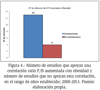En un intento de recoger evidencias de correlación entre ratio (F/B) aumentada y obesidad, se encontraron 17 artículos en los que existe asociación entre los términos: firmicutes bacteriodetes ratio y obesidad. No se pudo diseñar una estrategia de búsqueda que identificase artículos que apoyaban o no esta correlación, por lo que se llevó a cabo una revisión manual de los documentos encontrados. Se comprobó que 13 artículos apoyan una correlación positiva entre la ratio F/B aumentada y obesidad y cuatro no apoyaban esta correlación (Figura 4).