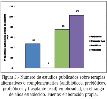 La Figura 5, muestra los resultados obtenidos en relación al número de publicaciones referidas con el uso de cada una de las terapias (administración oral de antibióticos, prebióticos y probióticos y TF) en obesidad, observándose una gran diferencia entre el número de artículos publicados asociados a obesidad entre antibióticos, prebióticos y probióticos con respecto al TF, del que se obtuvo únicamente un resultado.