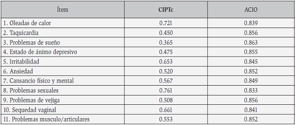 La MRS total mostró un coeficiente de alfa de Cronbach de 0,86. Por su parte, la dimensión somática alcanzó alfa de Cronbach de 0,63 (ítem 1, 2, 3 y 11); la psicológica 0,75 (ítem 4, 5, 6, y 7); y la urogenital 0,84 (ítem 8, 9 y 10). Las correlaciones corregidas y el alfa de Cronbach si el ítem se omitiera se presentan en la tabla 1.