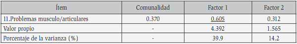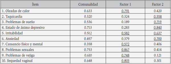 De otro lado, el análisis de factores arrojó que los ítems guardaban factores subyacentes, con coeficiente KMO superior a 0,800 y prueba de Bartlett con valor de p inferior a 0,05. Se identificaron dos dimensiones relevantes con valores propios superiores a 1,40. La primera dimensión que dio cuenta del 39,9% de la varianza y la formaron los ítems 1, 7, 8, 9, 10 y 11 que agrupan principalmente los síntomas tradicionalmente conocidos como somáticos y urogenitales de la menopausia. Y la segunda dimensión explicó el 14,2% de la varianza y reunió los ítems 2, 3, 4, 5 y 6 que abordan particularmente síntomas emocionales o psicológicos de la menopausia. La correlación de Pearson entre la primera y la segunda dimensión fue alta, 0,432 (p<0.001). La primera dimensión tuvo un alfa de Cronbach de 0,86; y la segunda, 0,81 y la varianza total que explicaron las dos dimensiones fue 54,1% de la varianza total (Tabla 3).