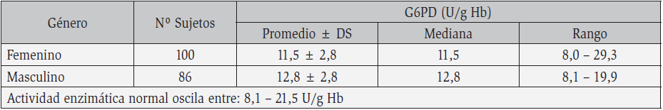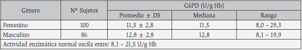 Resultaron con anemia moderada 88,6% de los individuos de la muestra, además todos los sujetos estudiados resultaron sin deficiencia de G6PD por prueba cualitativa y cuantitativa, y la actividad enzimática promedio en ellos fue de 12,1± 2,8 U/g Hb. Al segregar por género no se observó diferencia en la actividad de la enzima, al respecto la actividad enzimática fue de 11,5 ± 2,8 U/g Hb en las mujeres y de 12,8 ± 2,8 U/g Hb en los hombres (Tabla 2).