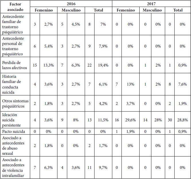 La tabla 3, contiene los resultados obtenidos a partir de 216 registros de la ficha nacional 356 V:00 y V:01 pertenecientes al año 2016 y el año 2017 hasta la semana epidemiológica 26. Para el apartado titulado, factores asociados al intento, se observa que el factor que más se presentó fue el de conflictos recientes con la pareja (44,9%), seguido de ideación suicida persistente (19,9%), consumo de SPA (12%) y pérdida de lazos afectivos (10,6%)
