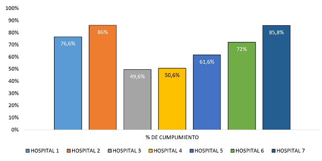 Como se observa en la Figura 1, el hospital 2 y el hospital 7 se encuentran con un porcentaje medio o aceptable de adherencia a las guías de atención Clínica en relación con los demás hospitales que tienen un porcentaje deficiente. Adicionalmente, se evidenciaron hallazgos como: diligenciamiento incompleto de las fichas CLAP (Centro Latino Americano de Perinatología) con un 72% de cumplimiento, en categoría deficiente; la curva de ganancia de peso y crecimiento uterino no se anotaban en cada uno de los controles; no se registra en la historia clínica y/o no se imparte la educación a la gestante; el ingreso al programa de Control Prenatal evidenciado en las distintas instituciones de salud iniciaba en el segundo y/o tercer trimestre de embarazo, lo cual supera ampliamente las recomendaciones de la OMS; no se cumple con los exámenes de laboratorio exigidos por la Guía de Control Prenatal y factores de riesgo de la Secretaria de Salud Distrital de Bogotá14,en las instituciones de salud evaluadas.