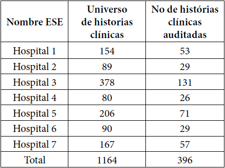 Para el desarrollo de la investigación se realizó un cálculo muestral19, teniendo en cuenta los siguientes factores: tamaño de la población, 1164; frecuencia esperada, 50%; nivel de confianza, 95% y porcentaje de error del 4%, lo que dio como resultado un tamaño muestral de 396 historias clínicas a auditar mediante la aplicación del instrumento.