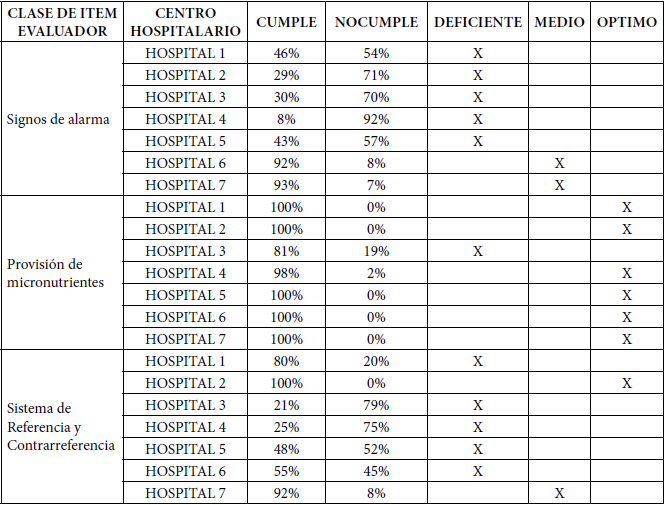 Igualmente, se determinó que solo el hospital 2 cumple al 100% óptimo con cuatro (66,6%) de los seis ítems evaluados (Clasificación del Riesgo obstétrico, historia clínica materno y carné materno perinatal, provisión de micronutrientes y referencia y Contrarreferencia). Mientras que el resto de hospitales no cumple en ninguno de los ítems evaluados, por lo que puede considerarse que en la subregión norte del departamento del Magdalena hay baja adherencia a la Guía de Atención de detección de las alteraciones del embarazo, parto y puerperio de la Resolución 412 de 200015.