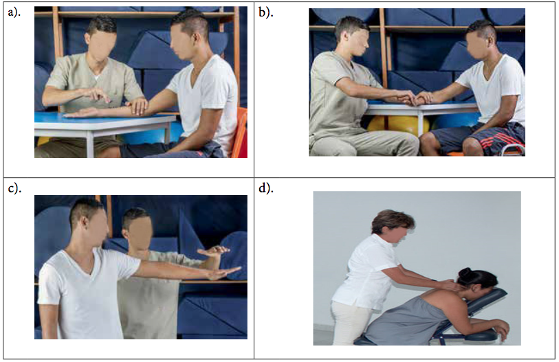 For the implementation of this study, patients identified by the inclusion and exclusion criteria were first told about the offer, having the objectives and work plan explained to them. Following that, four semiological trials were applied by the physiotherapists from the IPS in order to determine the coexistence of at least two of the following MSDs in the same patient: carpal tunnel syndrome, lateral epicondylitis, rotator cuff syndrome, and cervical myofascial syndrome.