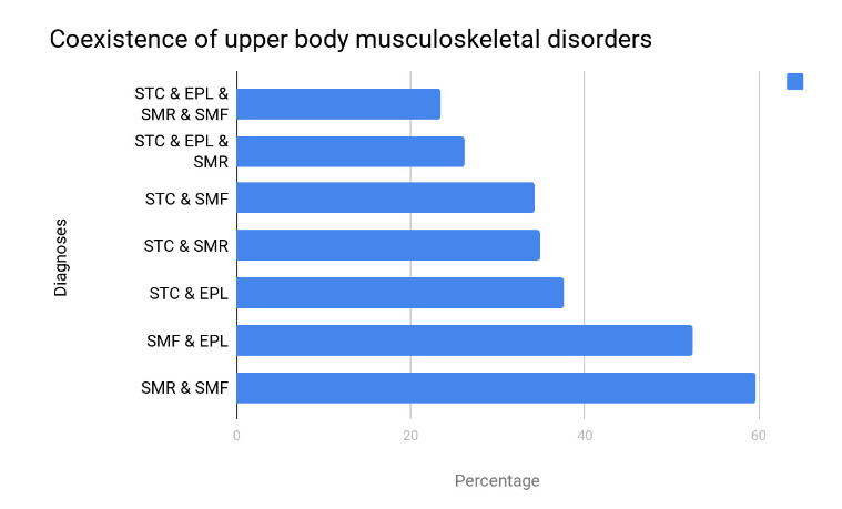 Abstract: The coexistence of musculoskeletal disorders is common in work activities around the world, however, information on the subject is insufficient both in Latin America and in Colombia despite its impact at the economic and social level. The objective of this research was to determine the coexistence of musculoskeletal disorders of work origin in the upper body in the working population that attends a Service Provider Institution (IPS). An observational, descriptive, quantitative, and cross-sectional design study was conducted between the first of March in 2017 and the first of March in 2018. Four semiological tests were applied for physiotherapists to seek the coexistence of carpal tunnel syndrome, lateral epicondylitis, rotator cuff syndrome, and cervical myofascial syndrome. Among the results, it was found that 92.6% (n=138) of the patients had two or more pathologies, 59.73% (n=89) had the rotator cuff and the myofascial syndrome, 52.35% (n=78) had epicondylitis and myofascial syndrome, and 37.58% (n=56) had carpal tunnel syndrome and lateral epicondylitis. This study highlights the high coexistence of musculoskeletal disorders in the upper body, especially in the female gender.