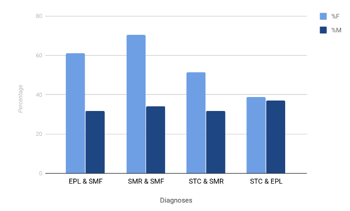 According to gender, the most commonly occurring osteomuscular injury in men was rotator cuff syndrome with a figure of 95.45% (n=42), followed by lateral epicondylitis with 61.3% (n=27). In women, the most commonly found disorder was cervical myofascial syndrome with a figure of 96.19% (n=101), followed by rotator cuff syndrome with 90.48% (n=95). On the other hand, the most frequent coexistence of MSD in both men and women was cervical myofascial syndrome (Figure 2).