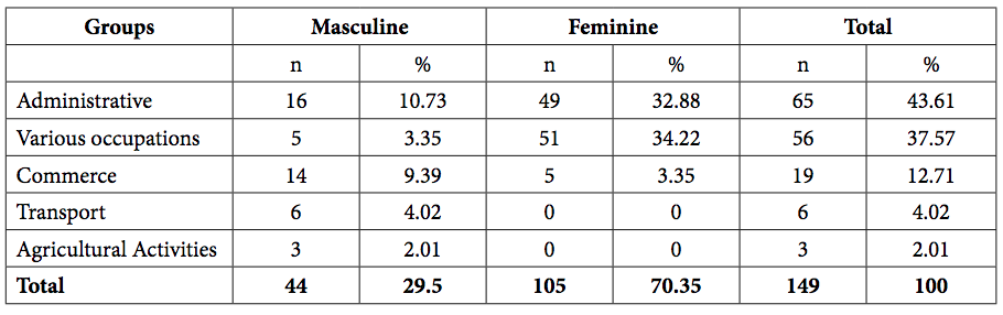 Since the participants were those who benefited from social security, activities linked to unprivileged administrative jobs were predominant in a manner surpassing a specific trade. 51 occupations were registered, grouped in five categories according to how similar each workplace activity performed was: Administrative (professionals and technologists who work in offices), Various occupations (in the case of women paid word related to the household, and in men activities of carpentry, gardening, and exterior cleaning). 100% of the women worked in activities related to the home, nevertheless only 34.22% (n=51) received payment for working in places other than their homes (Table 1).