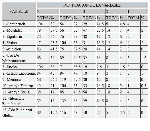 Se aplicó la escala geriátrica de evaluación funcional para obtener los criterios cubanos de fragilidad que presente el adulto mayor estudiado y así clasificarlo en ancianos frágiles y no frágiles. Esta escala tipo Likert consta de doce variables: continencia, movilidad, equilibrio, visión, uso de medicamentos, sueño, estado emocional, memoria y situación económica. A las cuales se les asignan valores del 1-5 en dependencia de la situación específica de salud del adulto mayor evaluado, posteriormente se obtiene una variable en base al promedio de las 12 variables y se consigue el estado funcional global del adulto mayor. Al final en base a los criterios cubanos de fragilidad se clasifica en adulto mayor frágil si presenta un criterio o adulto mayor no frágil, si no presenta ningún criterio1.