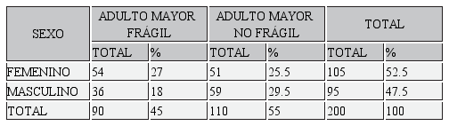 En base a los criterios cubanos de fragilidad 90 adultos mayores de esta comunidad se clasificaron con síndrome de fragilidad; el 27% de la población femenina (54) y el 18% (36) de la población masculina es frágil (Tabla 2).