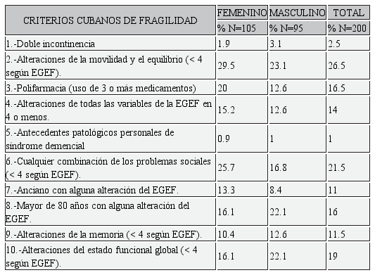 En orden de prevalencia el criterio de fragilidad “alteraciones de la movilidad y equilibrio” se presenta en el 26.5 % (53) de los adultos mayores, el 29.5 % pertenece al género femenino (105) y el 23.1 % (95) al género masculino. Este criterio va seguido de “cualquier combinación de los problemas sociales” con un 21.5%, con predominio en la población femenina. En tercer lugar, se encuentra la “polifarmacia” con un 16.5%, de este el género femenino representa un 20%. La frecuencia con que se presentan los criterios cubanos de fragilidad y el porcentaje que representan con respecto a la población general se visualiza en la Tabla 3.
