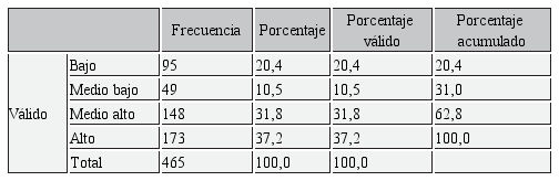 Para realizar una síntesis sobre el desempeño académico de los estudiantes universitarios es importante destacar que el 37,2 (173) % tuvo en desempeño alto, el 31.8% (148) corresponde a estudiantes con desempeño medio alto; el 10.5%( 49) corresponde a desempeño medio bajo, mientras el 20.4% (95) de los estudiantes tienen un rendimiento académico bajo (Tabla 1).