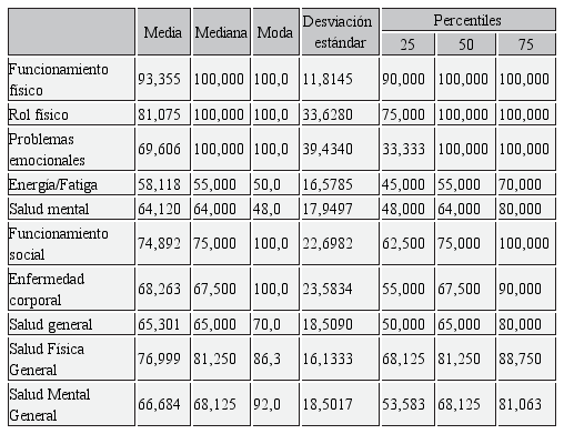 Al realizar el análisis de las subescalas de Calidad de Vida, se observa que en general, la salud física es la que presenta una mejor evaluación (76,9%) contra la salud mental con 66,6%. Al parecer el componente físico u orgánico sale mejor evaluado por los sujetos, lo cual se corresponde con la sub escala de funcionamiento físico que tiene la valoración más alta y positiva de todas (93,3%). Mientras que la sub escala de energía o fatiga es la más baja de todas (58,1%) y puede estar afectando la percepción de la salud mental. Además, la sub escala de problemas emocionales, que se relaciona con la salud mental, es la de mayor dispersión en toda la escala, indicando que los estudiantes de esta muestra presentan grandes diferencias a nivel emocional, es decir unos muy bien y otros muy mal (Tabla 2).