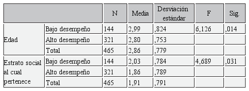 Los jóvenes sujetos de esta investigación, tienen en general un alto desempeño académico, pero sobre todo aquellos que son más jóvenes son los que mejor desempeño presentan, y los que están en un estrato social más bajo también.