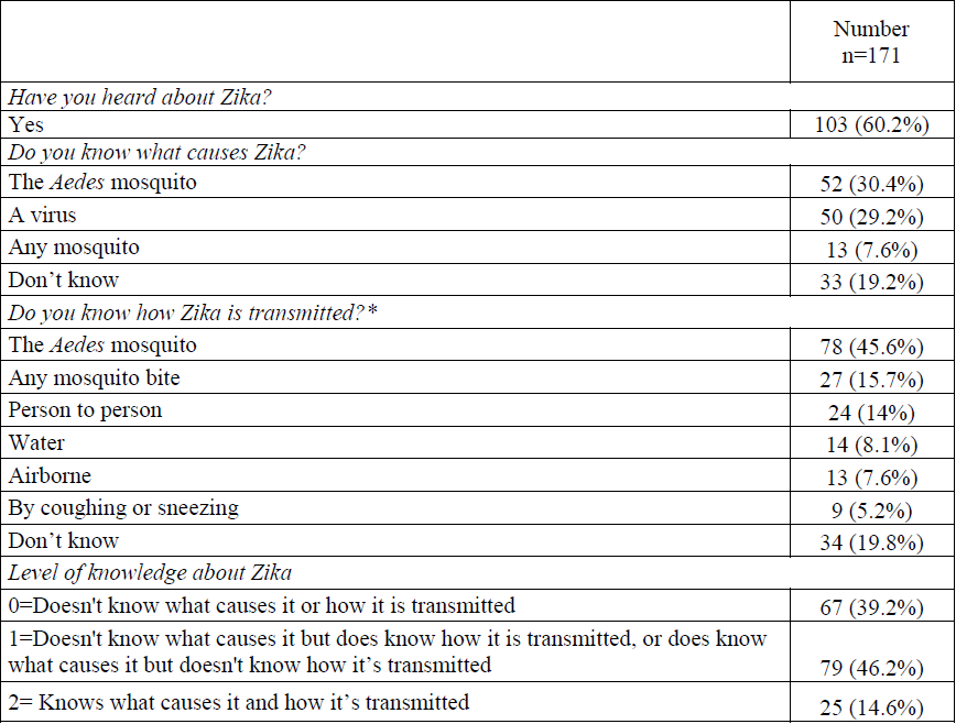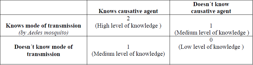 In order to assess the level of knowledge in regards to the causative agent and Zika's non sexual mode of transmission, the answers to, What causes Zika? and How is it transmitted? are analyzed together. The values assigned were: Low level of knowledge (Level 0), does not know the causative agent nor the mode of transmission; Medium level of knowledge (Level 1), does not know the causative agent but knows the mode of transmission, or knows the causative agent but not the mode of transmission, and High level of knowledge (Level 2), knows the causative agent and the mode of transmission (Table 1).