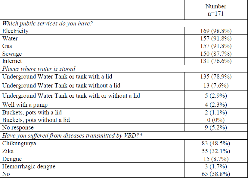 Of the 171 surveyed students, 119 (59%) were women and 52 (30.4%) were men, between 18 and 44 years of age, and an average age of 21.6 years. In terms of public services, the 98.8% of students have access to electricity, 91.8% to water and 87.7% to sewage; 78.9% store water in tanks with a cover and 7.6% in tanks without a cover (Table 2).