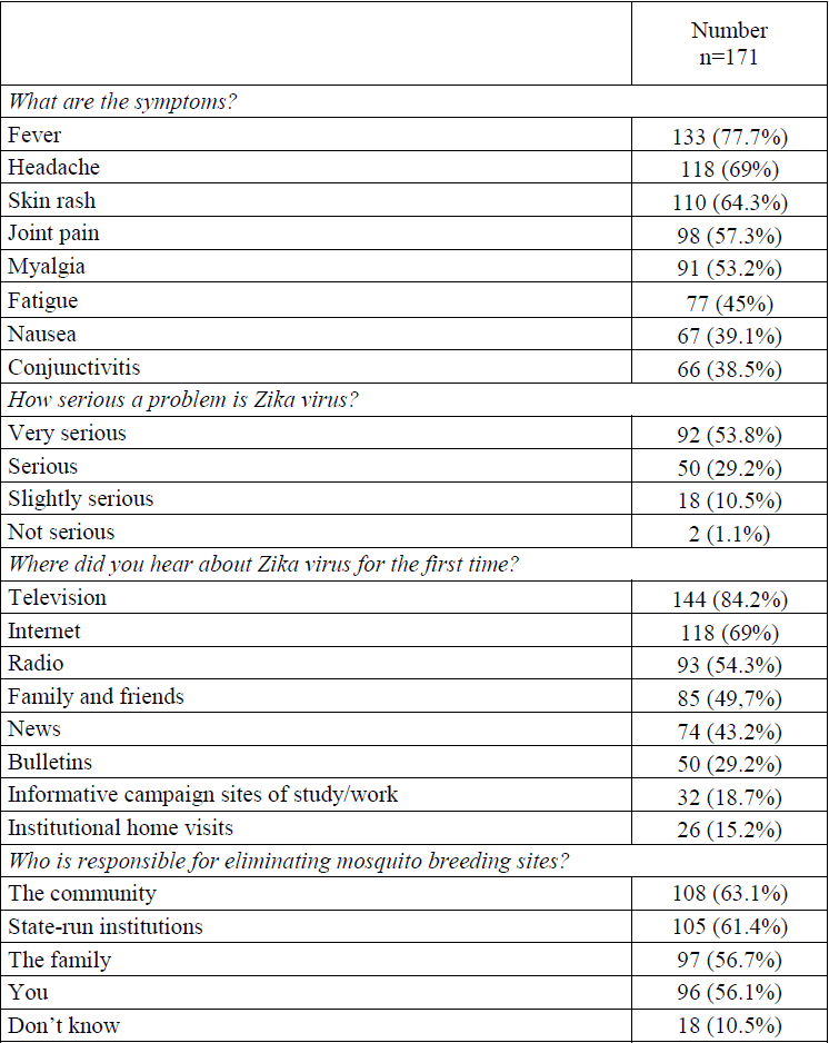 In terms of how they learned of Zika, 144 (84.2%) students learned about it through TV, 118 (69%) through Internet, 85 (49.7%) through family and friends, 26 (15.2%) through home visits and 32 (18.7%) through campaigns in their place of study and/or work. In terms of who is responsible for eliminating or controling mosquito breeding sites, students provided various answers, such as: 108 (63.1%) it should be the community, 105 (61.4%) state-run institutions, 97 (56.1%) the family, and 96(56.1%) themselves (Table 4).