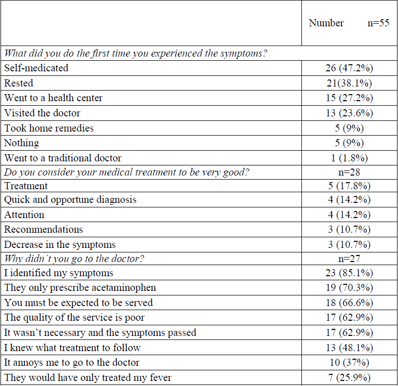 Of those who attended a healthcare center or visited a doctor (28 students), their perception of the healthcare system and treatment was as follows: four (14.2%) suggested that medical attention and diagnosis was very good, five (17.8%) considered treatment very good and three (10.7%) claimed that the recommendations and control of the symptoms were very good. In general, they considered the medical attention to be between fair and good. Those, who did not attend a health center and who had suffered from Zika (27 people) offered various reasons for not going: 23 (85.1%) identified symptoms without needing to go to the doctor, 19 (70.3%) believe professionals at the healthcare center only prescribe acetaminophen and 17 (62.9%) think the quality of the health service is poor (Table 5).