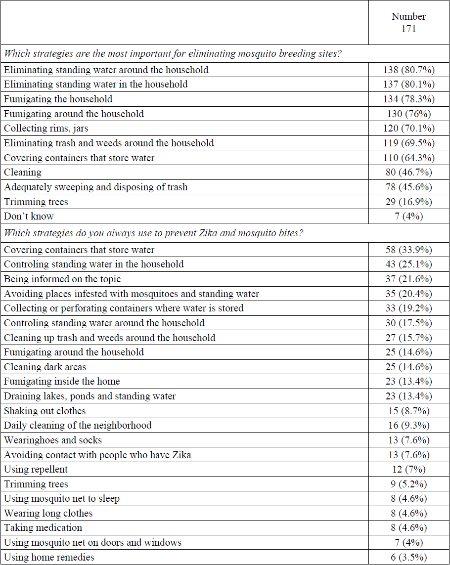 Of those surveyed, 15 (8.7%) stated that they have suffered from Dengue, three (1.7%) from Hemorrhagic dengue, 83 (48.5%) from Chikungunya, and 55 (32.1%) from Zika (Table 2). A total of 103 (60.2%) stated that they have heard of Zika. However, in analyzing the causative agent, only 50 (29.2%) know that it is a virus, 52 (30.4%) incorrectly said that it is caused by the Aedes mosquito, 33 (19,2%) did not know, and 13 (7.6%) answered “by any mosquito”. Regarding transmission, 78 (45.6%) considered the Aedes mosquito as responsible, 27 (15.7%) any mosquito, 24 (14%) that it is transmitted by other people and 34 (19.8%) do not know (Table 3).