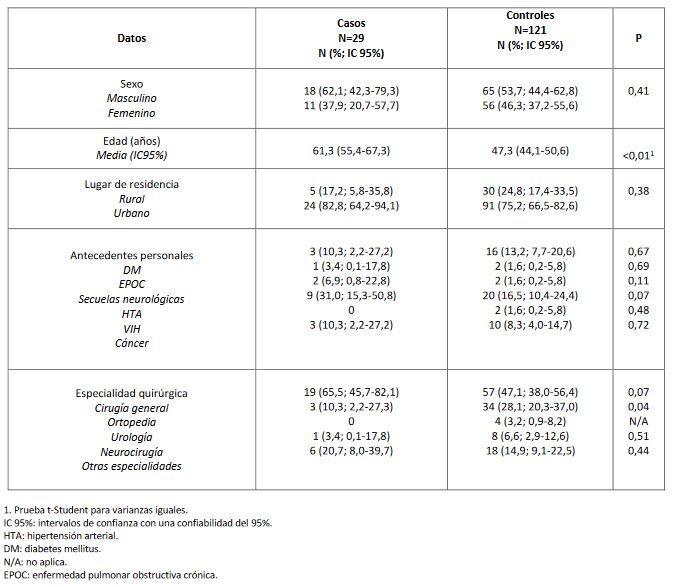 Se observó que los casos y los controles fueron homogéneos respecto al sexo, el lugar de residencia, los antecedentes personales y la especialidad quirúrgica. La edad fue estadísticamente mayor (ẋ=61,3 años IC 95% 55,4-67,3) en el grupo de los casos respecto a los controles. Las comorbilidades de mayor proporción en los pacientes infectados fueron: HTA (19,3%), DM (12,7%) y enfermedad oncológica (8,7%), sin diferencia significativa entre los grupos. Las especialidades de cirugía general y ortopedia tuvieron el mayor número de IHQ: 50,7% y 24,7% respectivamente (Tabla 1).