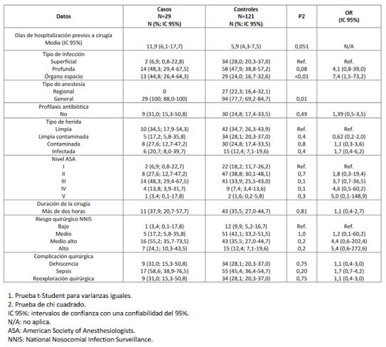 Factores como la no administración de profilaxis antibiótica, la duración del procedimiento por más de dos horas y la presencia de alguna complicación quirúrgica como dehiscencia, sepsis o la reexploración quirúrgica se presentaron en mayor proporción en los casos, pero sin significancia estadística.