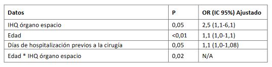 Al realizar el análisis de regresión logística se encontró que, controlando la edad y los días de hospitalización previos al procedimiento quirúrgico, la IHQ de tipo órgano espacio es un factor asociado a la letalidad en los pacientes infectados. La edad y los días de hospitalización son variables que se relacionan con la IHQ órgano espacio y con la letalidad. Por otra parte, en el análisis de interacción se evidenció que la edad modifica el efecto que produce la IHQ órgano espacio sobre la letalidad en los pacientes (Tabla 3).