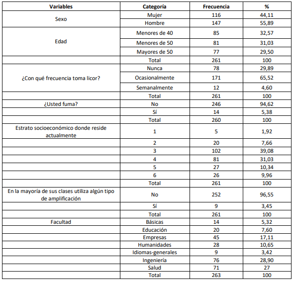 En la Tabla 1 se presenta la caracterización de la población de docentes universitarios. Se observa que casi el 56% eran hombres, cerca del 66% toma licor ocasionalmente, casi el 95% no fuma, el 80% reside entre los estratos 3 y 4, y solo el 3% utiliza algún tipo de amplificación durante las clases. Las facultades de salud e ingenierías fueron en las que más docentes respondieron la encuesta, entre el 27% y el 29% respectivamente.
