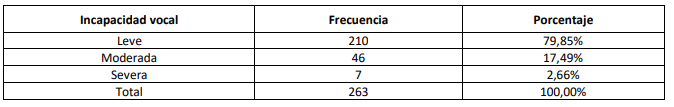En relación con la frecuencia de casos de incapacidad vocal de los docentes universitarios que respondieron la encuesta, se observó que cerca del 17% presentó incapacidad vocal moderada, y cerca del 3% presentó incapacidad vocal severa; ninguno presentó incapacidad vocal grave (Tabla 2).