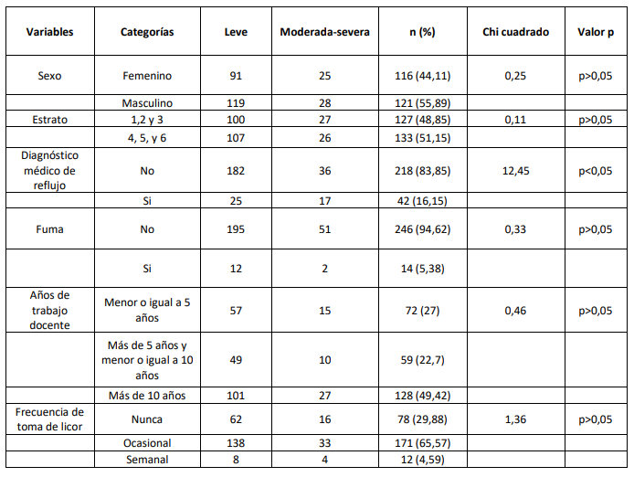 Se procedió a dicotomizar la variable de los niveles de incapacidad vocal tomando, por un lado, la incapacidad leve y uniendo, por otro lado, los niveles de incapacidad moderada y severa. El nivel de incapacidad leve estuvo representado en casi el 80% de la población (79,85%). Sucesivamente, para llevar a cabo los análisis por chi cuadrado, se dicotomizaron las demás variables. En los análisis por chi cuadrado solo se observó asociación estadísticamente significativa entre incapacidad vocal y el diagnóstico médico de reflujo (X2=12,45 y p=0,00041) (Tabla 3).