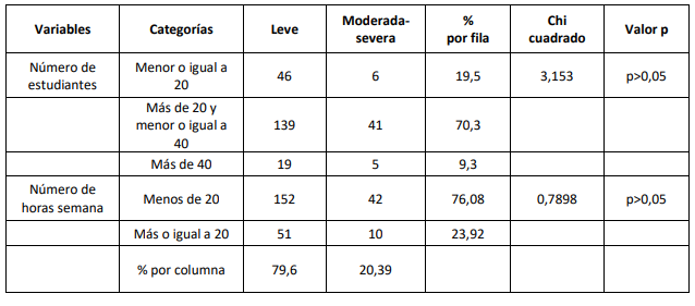 En la Tabla 4 se presentan los análisis por chi cuadrado entre el índice de incapacidad vocal (leve vs. moderada-severa) y el número de estudiantes y el número de horas de clase por semana, donde no se observó ninguna asociación estadísticamente significativa.