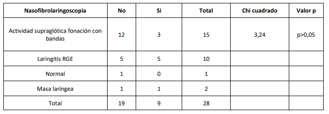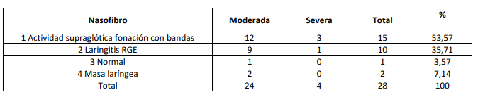 En la Tabla 5 se observan las frecuencias de los profesores universitarios que presentaron incapacidad vocal y que fueron evaluados clínicamente. Solo se evaluaron 28 profesores de 53 que presentaron incapacidad moderada y severa porque estos fueron los que acudieron voluntariamente a la cita con el especialista en otorrinolaringología para la realización de nasofibrolaringoscopia. Según la tabla, cerca del 54% (15/28) de los profesores presentaron actividad supraglótica y fonación con bandas. Así mismo se detectaron dos profesores con una lesión supraglótica a nivel de cuerdas falsas, quienes se canalizaron para microcirugía laríngea, la cual estaba pendiente al cierre de este estudio.