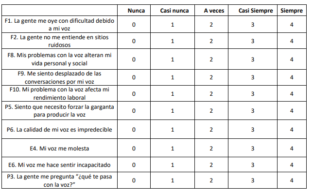 Para valorar la alteración vocal encontramos diferentes pruebas. Entre ellas, el VHI fue desarrollado con el fin de cuantificar el impacto percibido por un sujeto afectado por un trastorno vocal. El VHI es el cuestionario más versátil y fácil de completar por el paciente y contiene la información más relevante acerca de la calidad de vida relacionada con la voz. Este instrumento contiene 30 ítems, si bien existe la versión acortada de 10 ítems que tiene la misma validez y fiabilidad. En la versión acortada (VHI-10), las preguntas 1 a 5 reflejan el aspecto funcional; las preguntas 6, 7 y 10, el aspecto físico, y las preguntas 8 y 9, el rubro emocional6.
