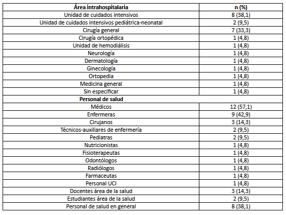 Una amplia gama de bacterias fueron aisladas a partir de los teléfonos celulares. Por su compromiso con enfermedades nosocomiales, dentro del grupo de las Gram positivas se destacan Staphylococcus aureus (85,7%) Enterococcus faecalis (9,5%) y, en el grupo de las Gram negativas, Escherichia coli (61,9%), Klebsiella pneumoniae (23,8%) y Pseudomonas aeruginosa (38,1%) (Tabla 4). En cuanto al área asistencial donde más se han adelantado investigaciones, la UCI predominó (38,1%), seguida de cirugía general (33,1%). Finalmente, el personal de salud al que más se le ha realizado aislamientos bacteriológicos en sus teléfonos celulares han sido médicos (57,1%) y enfermeras (42,9%) (Tabla 5).