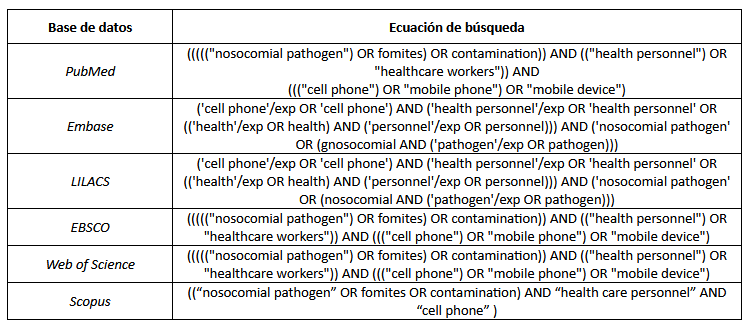 La búsqueda de información se realizó utilizando términos MeSH y DeSC en seis bases de datos ―PubMed, EBSCO, Web of Science, Embase, Scopus y LILACS― con las palabras “nosocomial pathogen”, “fomites”, “contamination”, “health personnel”, “healthcare workers”, “cell pone”, “mobile phone” y “mobile device”. Mediante el uso de ecuaciones de búsqueda previamente definidas (Tabla 1), se recolectaron artículos aplicados con los filtros correspondientes a los criterios de elegibilidad (fecha e idioma). De forma preliminar, se revisaron títulos y resúmenes para descartar aquellos artículos que no fueran originales o que no correspondieran con la temática de la revisión. La búsqueda de información se llevó a cabo entre junio y septiembre de 2018.