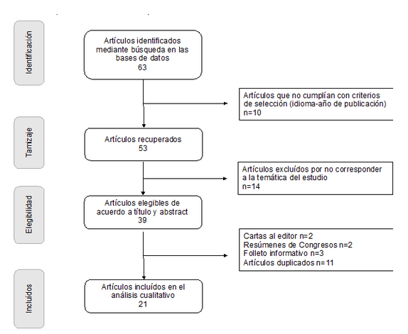 Tras aplicar las ecuaciones de búsqueda, se identificó un total de 63 artículos. El proceso de filtración permitió excluir de las bases de datos de PubMed y Scopus artículos publicados en idiomas diferentes al inglés, el español y el portugués, así como los que no estaban disponibles en texto completo y que se habían publicado antes del año 2008 (segunda etapa de la búsqueda sistemática). De este modo quedaron 53 artículos que fueron revisados por título y resumen, con lo que se descartaron 14 (tercera etapa de la búsqueda). Así quedaron 39 artículos preseleccionados, los cuales se revisaron para identificar duplicados entre las diferentes bases de datos, y con ello se descartaron 11 artículos (cuarta etapa de la búsqueda sistemática). Finalmente, con la revisión de la versión completa de los artículos se descartaron 7 (cartas al editor n=2, resúmenes en eventos científicos n=2, folletos informativos n=3), lo que dejó un total de 21 artículos para la revisión sistemática (Figura 1).