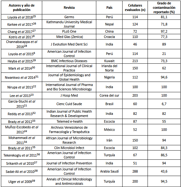 Contaminación bacteriológica en teléfonos celulares de trabajadores de la salud en ambiente clínico: revisión sistemática