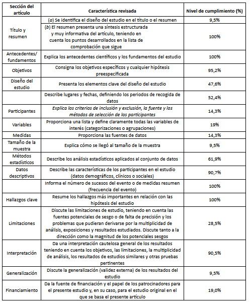 Para evaluar el riesgo de sesgo de las publicaciones incluidas en la revisión sistemática, se aplicó la lista de chequeo STROBE. En la Tabla 3 se puede observar que los artículos cumplieron a cabalidad con estas características: resumen, antecedentes científicos, resultados, discusión de hallazgos claves. Por el contrario, tuvieron bajo cumplimiento apartados como: tipos de estudio (9,5%), criterios de selección (14,4%), variables de interés (19%), fuentes de datos (14,3%) y fuente de financiación de los estudios (19%).