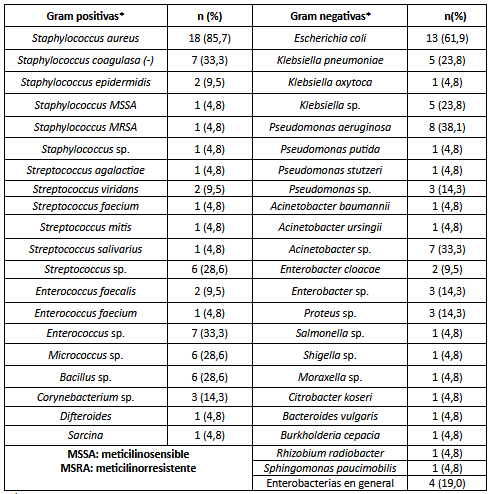 El microorganismo Gram positivo identificado con mayor frecuencia en los 21 estudios incluidos fue el S. aureus (85,7%). Este dato es consistente con lo reportado por Ulger et al en la revisión de la literatura de 2015, quienes encontraron este agente etiológico en 26 de 39 estudios revisados (66,7%), los cuales habían sido publicados entre 2005 y 201312. En el mundo se estima que cerca del 30% de la población es portadora asintomática de esta bacteria, la cual hace parte de la microbiota nasal, de donde fácilmente se puede transmitir a las manos y a los dispositivos móviles del personal de la salud y causar infecciones nosocomiales41. Otra situación preocupante frente a este agente es la resistencia generada a la meticilina, pues un metaanálisis de reciente publicación evidenció que la prevalencia media de portadores de S. aureus meticilinorresistente es de 3,5% de los 4,5 billones individuos de la región de Asia-Pacífico, lo que constituye un problema de salud pública emergente42.