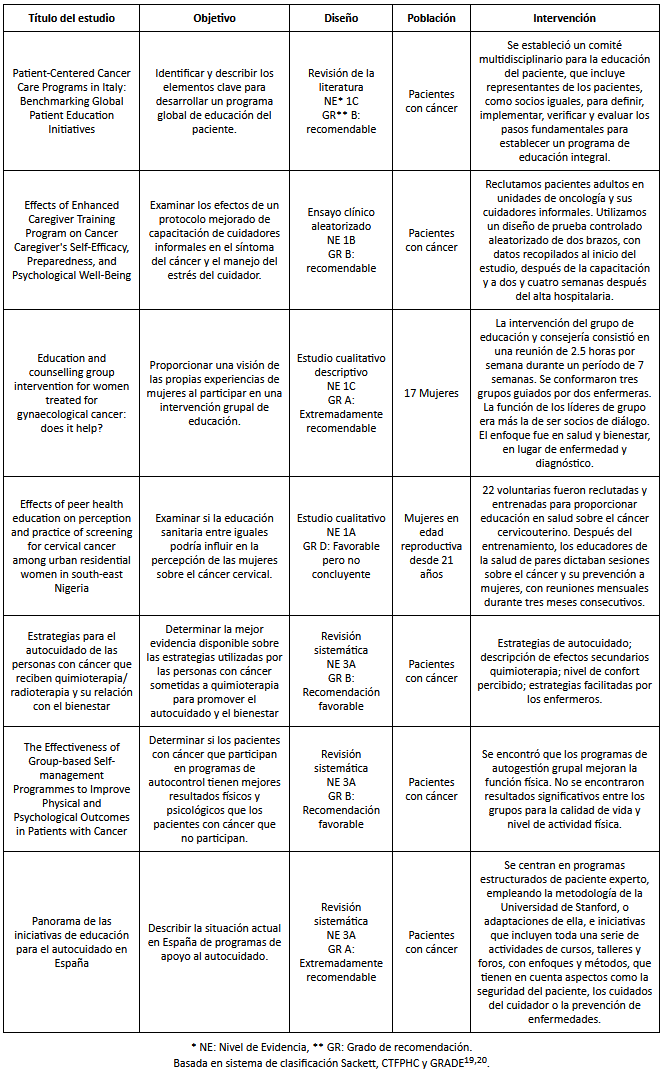Se creó una plantilla de búsqueda en formato @Excel, en la que se recogieron los datos de los artículos seleccionados, los criterios de selección de la literatura se basaron en investigaciones primarias y secundarias, en los idiomas español, inglés y portugués, publicadas entre el periodo comprendido del año 2012 a 2017. Se incluyeron como diseños de estudio: revisiones sistemáticas, con o sin metaanálisis, ensayos clínicos, estudios cuasiexperimentales y estudios descriptivos, cuantitativos o cualitativos en los que los sujetos fueron pacientes oncológicos y en los que se evidenció la educación interpares.